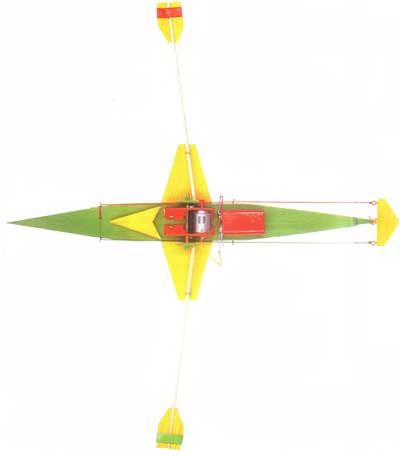 أصبغها، وحين تجف الصق القطعة "ب" عبر مركز القطعة "أ". أدخل أربعة براغي دائريةالرؤوس في الدفة، واثنين في مؤخرة البدن كما مبين في الصورة أعلاه.