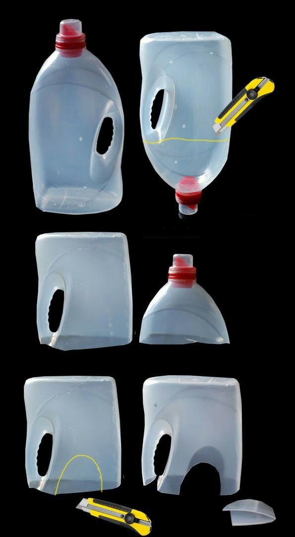 - قص علبة فارغة (gallon) من طرف اليد بشكل خط مستقيم بالشفرة.